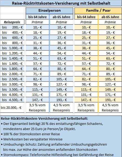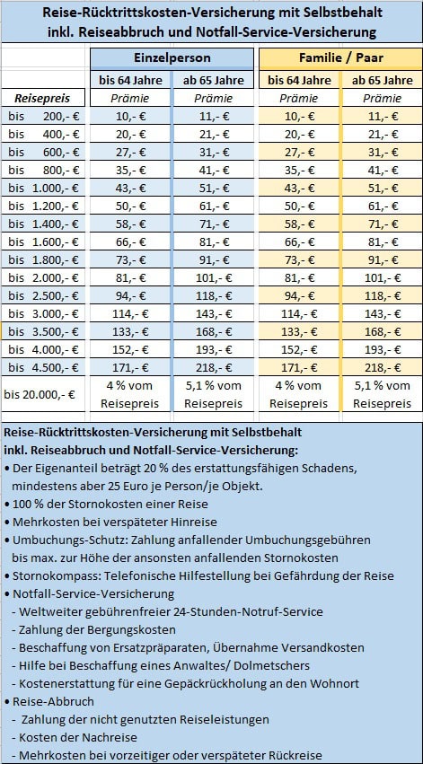 Die Versicherungsprämien richten sich nach der Höhe des Gesamt-Reisepreises zusammen mit Ihren ggf. gebuchten Zusatzleistungen (Prämien siehe Infobutton). ​​​​​​​