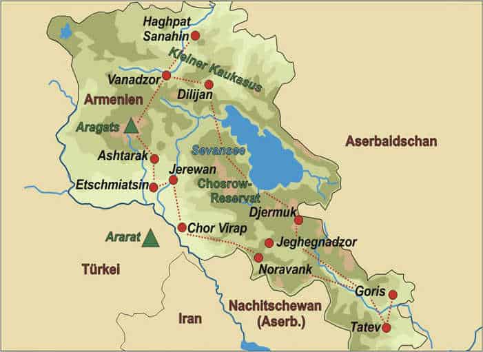 Fahrzeit ca. 4 Std., 140 km, Gehzeit 5-6 Std. +/- 700 Hm, Übernachtung im Hotel, F/-/A.13. Tag (Fr) Abschied von Armenien und RückflugTransfer zum Flughafen und individueller Rückflug in die Heimat (F/-/-)